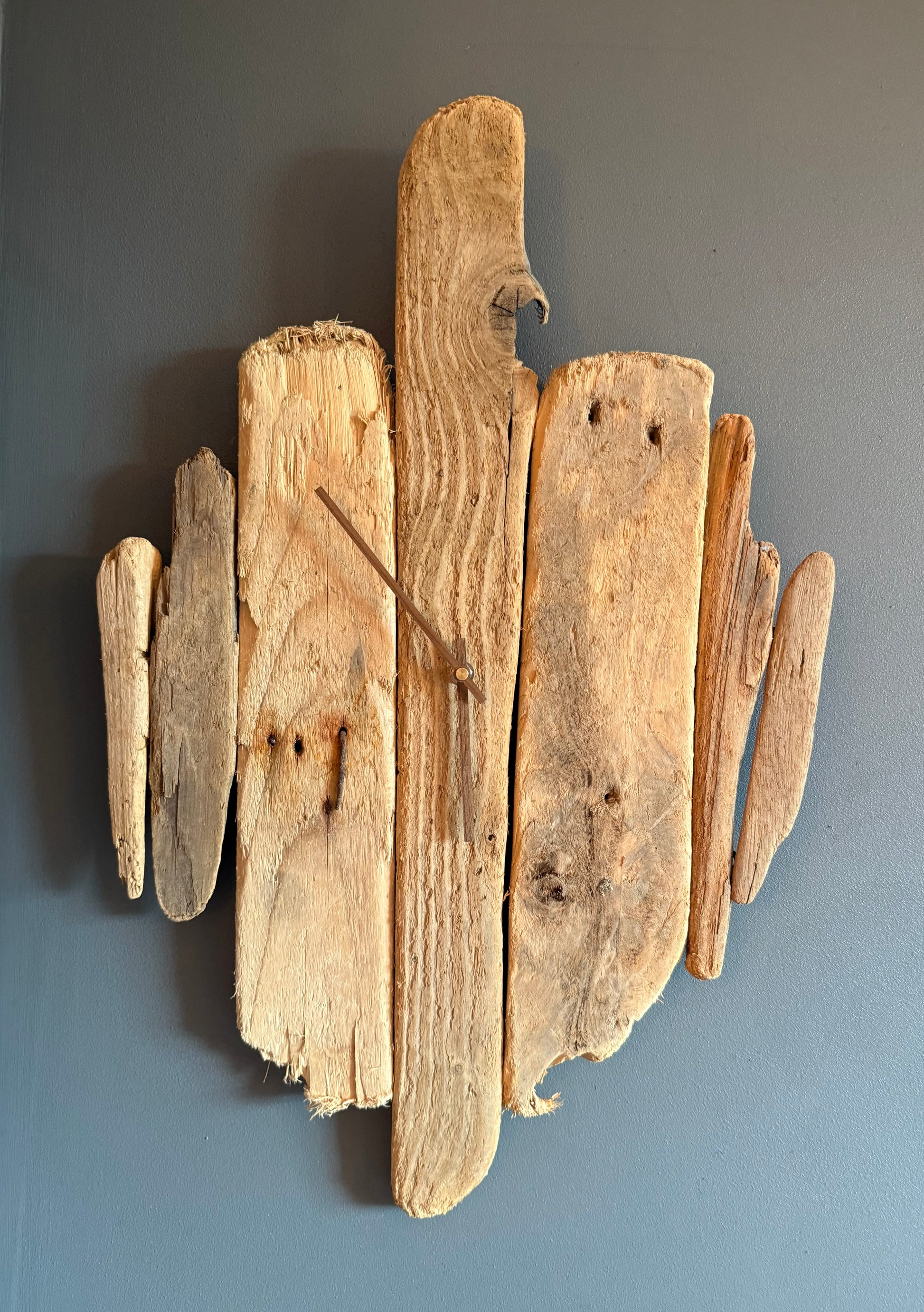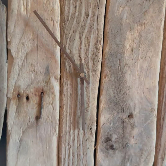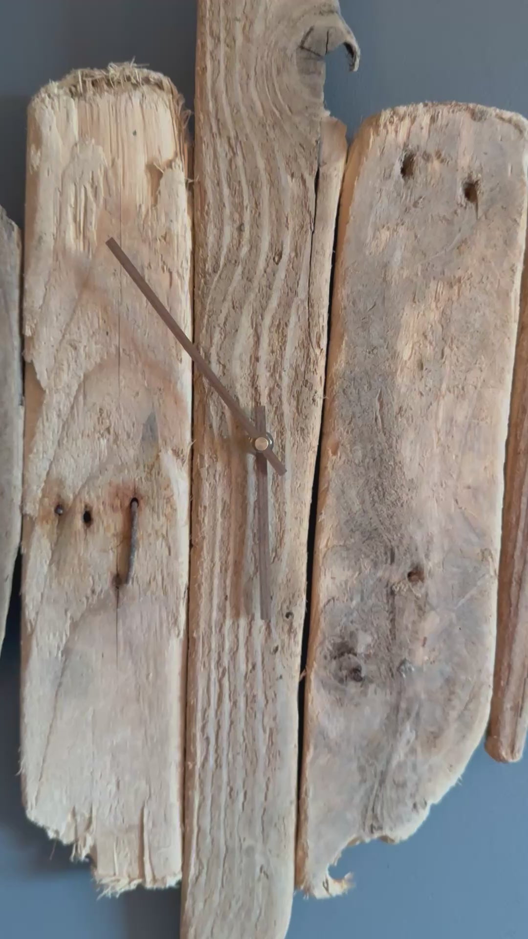 Handcrafted from reclaimed weathered flat wood, this weathered wood wall clock adds a touch of rustic charm to any room. Standing at 64cm tall and 40cm wide, it is the perfect size to be a statement piece without overpowering your space. Elevate your home decor with this one-of-a-kind handmade piece. Fitted with silent sweeping clock movement.