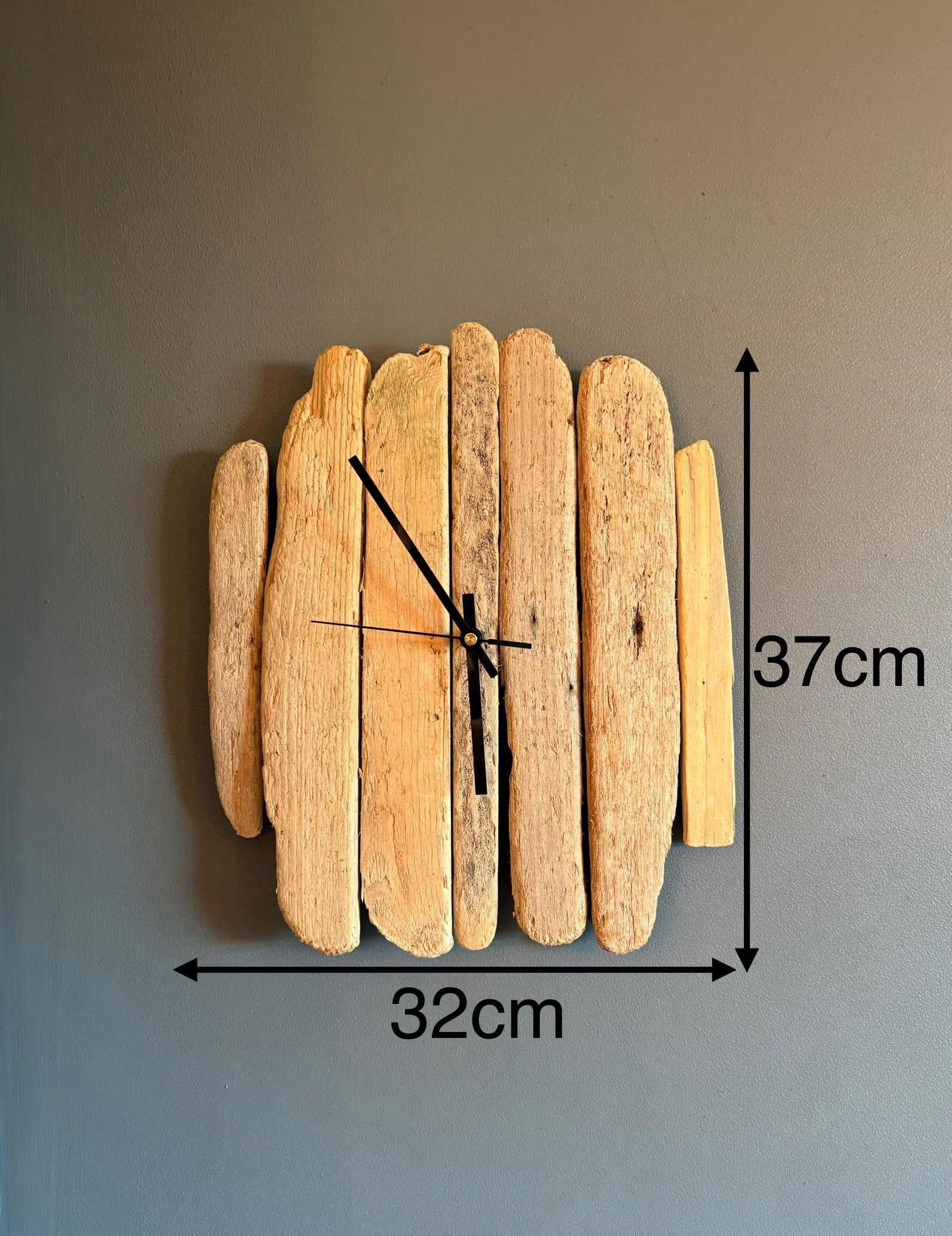 Handcrafted from authentic beach driftwood, this weathered wood wall clock adds a touch of rustic charm to any room. Standing at 37cm tall and 32cm wide, it is the perfect size to be a statement piece without overpowering your space. Elevate your home decor with this one-of-a-kind handmade piece. Fitted with silent sweeping clock movement.
